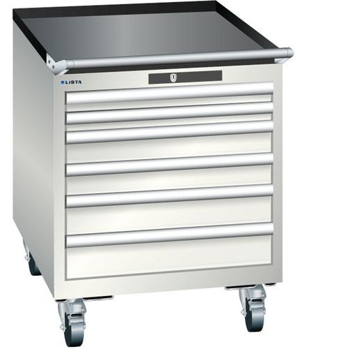 Bordázott csúszásgátló alátét a szekrény tetején. Védelem por és folyadékok ellen a zárt keretnek köszönhetően, amely ütés- és kopásálló felülettel rendelkezik. Biztonsági zár a fiókok leesése és egyedi zárása érdekében (borulásvédelem). Korrózióvédelem elektroforetikus immerziós festéssel és szórással. Professzionális címkézés LISTA Script címkézőszoftverrel és felhajtható címkebehelyező fogantyúval. Tökéletesen csendes mozgás a keresztléc nélküli csúszkának köszönhetően. A mozgást 4 kerék és egy fogantyú teszi lehetővé. Kulcsos zár. Max. terhelés (kg) : 75 kg