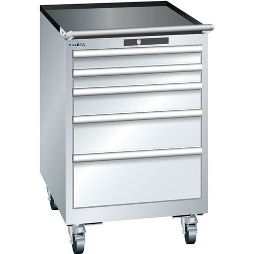 Bordázott csúszásgátló alátét a szekrény tetején. Védelem por és folyadékok ellen a zárt keretnek köszönhetően, amely ütés- és kopásálló felülettel rendelkezik. Biztonsági zár a fiókok leesése és egyedi zárása érdekében (borulásvédelem). Korrózióvédelem elektroforetikus immerziós festéssel és szórással. Professzionális címkézés LISTA Script címkézőszoftverrel és felhajtható címkebehelyező fogantyúval. A mozgást 4 kerék és egy fogantyú teszi lehetővé. Kulcsos zár. Tökéletesen csendes mozgás a keresztléc nélküli csúszkának köszönhetően.
