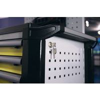 LISTA műhelyfiókos kocsik, multiplex furnér munkalap, 4 fiók Robusztus, 40 mm-es, multiplex furnérból készült fa lappal felszerelve, amely tartós és alkalmas satu felszerelésére KULCSOS központi zár - cserélhető hengerzárbetétek Biztonsági eszköz, amely megakadályozza a fiókok véletlen kinyílását Fiók teherbírása 40 kg 4 görgő - 2 forgó (fékkel) és 2 fix, Lehetőség van evőeszközök rögzítésére a kocsi oldalfalaihoz