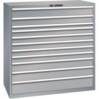 Lista műhelyszekrény 11 teljesen kihúzható fiókkal, akár 200 kg teherbírással. Védelem a por és folyadékok ellen a zárt keretnek köszönhetően, amely ütés- és kopásálló felülettel rendelkezik. Esésgátló biztonsági eszköz, amely megakadályozza a fiók leesését, és egyedi fiókzár (billenésgátló rendszer). Korrózióvédelem elektroforetikus merítéses festéssel és szórással. Professzionális címkézés LISTA Script címkézőszoftverrel és felhajtható címkebehelyező fogantyúval Tökéletesen csendes mozgás a keresztléc nélküli csúszkának köszönhetően Max. terhelés (kg) : 200 kg