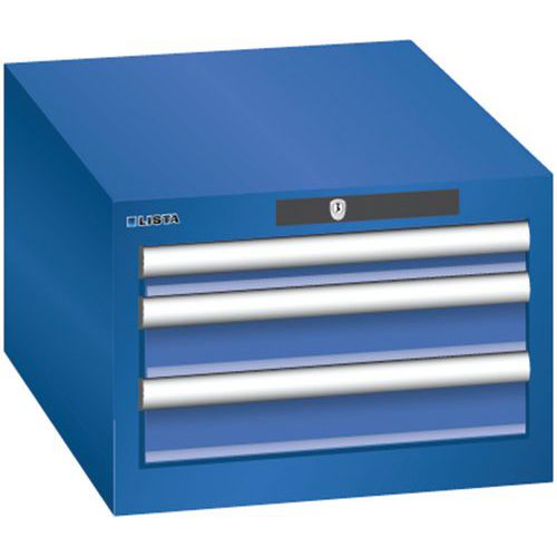 Lista műhelyfiókos szekrények, 2 vagy 3 fiókkal. Kulcsos zár. Optimális használat a teljes kihúzásnak és az optimális fiókelőlap-magasságnak köszönhetően. Kiváló védelem a por, folyadékok és mechanikai kopás ellen a zárt keretnek köszönhetően, amelynek felülete ütés- és kopásálló. Borulásgátló rendszer, amely megakadályozza a fiók leesését, és egyedi fiókzár. Korrózióvédelem elektroforetikus merítéses festéssel és szórással. Optimalizált tárolóhely és rendszerezés a minden egyes alkalmazáshoz igazított LISTA elválasztóknak és a hornyokkal és perforációkkal ellátott fiókoknak köszönhetően. Professzionális címkézés LISTA Script címkézőszoftverrel és felhajtható címkebehelyező fogantyúval. Tökéletesen csendes mozgás a keresztléc nélküli csúszkának köszönhetően A fiókelválasztók nem tartozékok. Külön kell megvásárolni. Max. terhelés (kg) : 75 kg