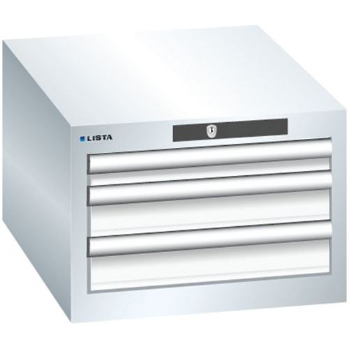 Lista műhelyfiókos szekrények, 2 vagy 3 fiókkal. Kulcsos zár. Optimális használat a teljes kihúzásnak és az optimális fiókelőlap-magasságnak köszönhetően. Kiváló védelem a por, folyadékok és mechanikai kopás ellen a zárt keretnek köszönhetően, amelynek felülete ütés- és kopásálló. Borulásgátló rendszer, amely megakadályozza a fiók leesését, és egyedi fiókzár. Korrózióvédelem elektroforetikus merítéses festéssel és szórással. Optimalizált tárolóhely és rendszerezés a minden egyes alkalmazáshoz igazított LISTA elválasztóknak és a hornyokkal és perforációkkal ellátott fiókoknak köszönhetően. Professzionális címkézés LISTA Script címkézőszoftverrel és felhajtható címkebehelyező fogantyúval. Tökéletesen csendes mozgás a keresztléc nélküli csúszkának köszönhetően A fiókelválasztók nem tartozékok. Külön kell megvásárolni. Max. terhelés (kg) : 75 kg