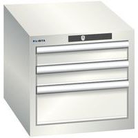 Lista műhelyfiókos szekrények, 3 vagy 4 fiókkal. Kulcsos zár. Optimális használat a teljes kihúzásnak és az optimális fiókelőlap-magasságnak köszönhetően. Kiváló védelem a por, folyadékok és mechanikai kopás ellen a zárt keretnek köszönhetően, amely ütés- és kopásálló felülettel rendelkezik. Borulásgátló rendszer, amely megakadályozza a fiók leesését, és egyedi fiókzár. Korrózióvédelem elektroforetikus merítéses festéssel és szórással. Optimalizált tárolóhely és rendszerezés a minden egyes alkalmazáshoz igazított LISTA elválasztóknak és a hornyokkal és perforációkkal ellátott fiókoknak köszönhetően. Professzionális címkézés LISTA Script címkézőszoftverrel és felhajtható címketartóval. Tökéletesen csendes mozgás a keresztléc nélküli csúszkának köszönhetően A fiókelválasztók nem tartozékok. Külön kell megvásárolni. Max. terhelés (kg) : 75 kg