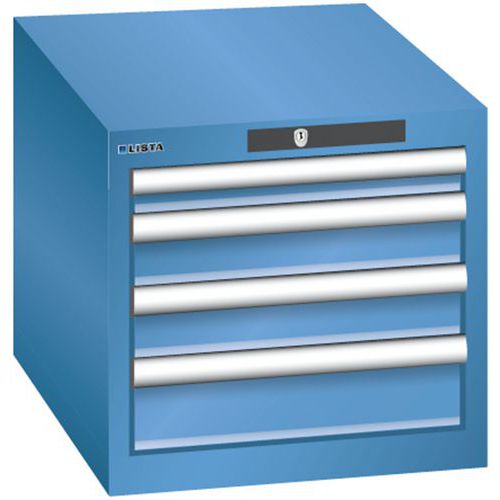Lista műhelyfiókos szekrények, 3 vagy 4 fiókkal. Kulcsos zár. Optimális használat a teljes kihúzásnak és az optimális fiókelőlap-magasságnak köszönhetően. Kiváló védelem a por, folyadékok és mechanikai kopás ellen a zárt keretnek köszönhetően, amely ütés- és kopásálló felülettel rendelkezik. Borulásgátló rendszer, amely megakadályozza a fiók leesését, és egyedi fiókzár. Korrózióvédelem elektroforetikus merítéses festéssel és szórással. Optimalizált tárolóhely és rendszerezés a minden egyes alkalmazáshoz igazított LISTA elválasztóknak és a hornyokkal és perforációkkal ellátott fiókoknak köszönhetően. Professzionális címkézés LISTA Script címkézőszoftverrel és felhajtható címketartóval. Tökéletesen csendes mozgás a keresztléc nélküli csúszkának köszönhetően A fiókelválasztók nem tartozékok. Külön kell megvásárolni. Max. terhelés (kg) : 75 kg