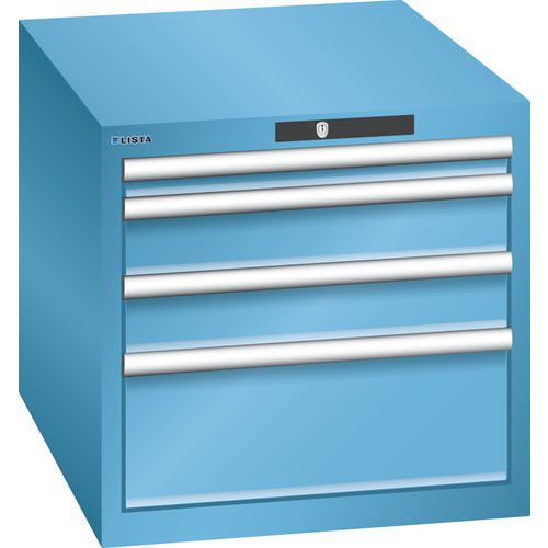 Védelem por és folyadékok ellen a zárt keretnek köszönhetően, amely ütés- és kopásálló felülettel rendelkezik Biztonsági zár a fiókok leesése és egyedi zárása érdekében (borulásvédelem). Korrózióvédelem elektroforetikus immerziós festéssel és szórással. Professzionális címkézés LISTA Script címkézőszoftverrel és felhajtható címkebehelyező fogantyúval. Tökéletesen csendes mozgás a keresztléc nélküli csúszkának köszönhetően. Kulcsos zár. Max. terhelés (kg) : 75