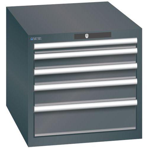 Védelem por és folyadékok ellen a zárt keretnek köszönhetően, amely ütés- és kopásálló felülettel rendelkezik Biztonsági zár a fiókok leesése és egyedi zárása érdekében (borulásvédelem). Korrózióvédelem elektroforetikus immerziós festéssel és szórással. Professzionális címkézés LISTA Script címkézőszoftverrel és felhajtható címkebehelyező fogantyúval. Tökéletesen csendes mozgás a keresztléc nélküli csúszkának köszönhetően. Kulcsos zár.