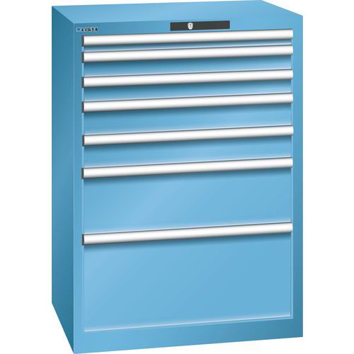 Védelem por és folyadékok ellen a zárt keretnek köszönhetően, amely ütés- és kopásálló felülettel rendelkezik. Biztonsági zár a fiókok leesése és egyedi zárása érdekében (borulásvédelem). Korrózióvédelem elektroforetikus immerziós festéssel és szórással. Professzionális címkézés LISTA Script címkézőszoftverrel és felhajtható címkebehelyező fogantyúval. Tökéletesen csendes mozgás a keresztléc nélküli csúszkának köszönhetően. Kulcsos zár. Max. terhelés (kg) : 75
