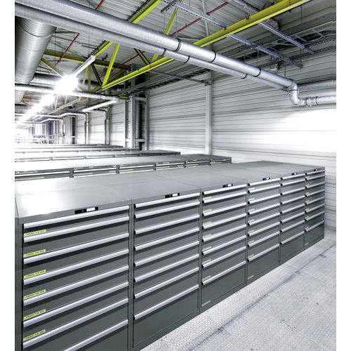 Védelem por és folyadékok ellen a zárt keretnek köszönhetően, amely ütés- és kopásálló felülettel rendelkezik. Biztonsági zár a fiókok leesése és egyedi zárása érdekében (borulásvédelem). Korrózióvédelem elektroforetikus immerziós festéssel és szórással. Professzionális címkézés LISTA Script címkézőszoftverrel és felhajtható címkebehelyező fogantyúval. Fiók teherbírása 75 kg vagy 200 kg. Tökéletesen csendes mozgás a keresztléc nélküli csúszkának köszönhetően. Kulcsos zár. Max. terhelés (kg) : 200