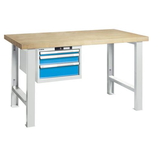 Tartós bükkfa munkalap. Acélszerkezet, porfestéssel kezelve. Nagy stabilitás és teherbírás akár 600 vagy 1500 kg-ig. Fiók teherbírása 75 kg