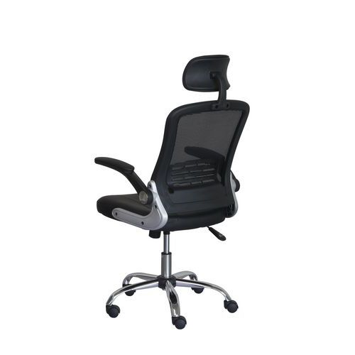 Modern irodai szék fejpárnával szitaszövet háttámlával és ülőlappal fekete színben. Az ülőlap magassága gázrugóval állítható. A szék előnye a hintamechanika és a krómozott tartó csillagtalp. A székek lehajtható kartámlákkal rendelkeznek.