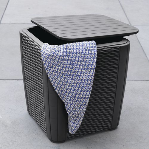 A praktikus kerti asztal lekerekített sarkokkal tökéletesen kiegészíti a terasz, pergola vagy erkély ülőhelyeit. Tárolódobozként is szolgál a kanapék, párnák, takarók stb. számára. Kiváló minőségű műanyagból készült, rattan utánzatban. Időjárás- és UV-álló.