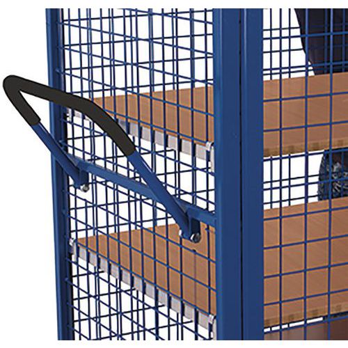 Ketreces kocsik hálós oldalakkal és mennyezettel, 50 x 50 mm-es hálómérettel. Kétszárnyú ajtó kétpontos kulcsos zárral. MDF lapból készült rakodófelület és polcok, a polcok 50 mm-es lépésekben változtathatóan beilleszthetők. Összecsukható vonóhorog. 2 fix és 2 forgó kerék EasySTOP fékkel. Szürke, nyommentes, termoplasztikus gumi kerekek műanyag felnin, precíziós golyóscsapágyakkal. Vázfelület-kezelés RAL skála szerinti porfestékkel. Ütés- és karcálló. Az EasySTOP központi fékrendszer mindkét forgó kereket bármilyen helyzetben rögzíti a pedál egyszerű megnyomásával. A pedál működtetéséhez nincs szükség munkavédelmi lábbelire vagy védőcipőre. Teherbírás (kg) : 500 kg
