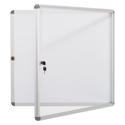 Zárható vitrin mágneses prezentációhoz és az információk tárolására. Alumínium keret műanyag lábakkal, fehér lakkozott fém tábla és akril üveg. Hengerzárral zárható, három kulccsal szállítjuk.
