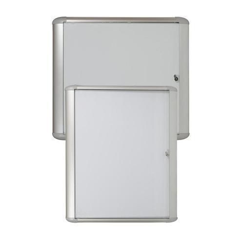 Mágneses szekrények lekerekített élekkel és eloxált alumínium kerettel beltérbe. Akril ajtó és 4 mm vastag biztonsági üveg. A vitrinek zárhatók, oldalsó nyitással.