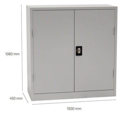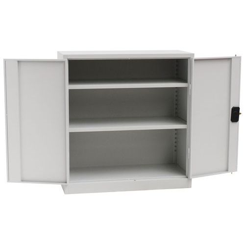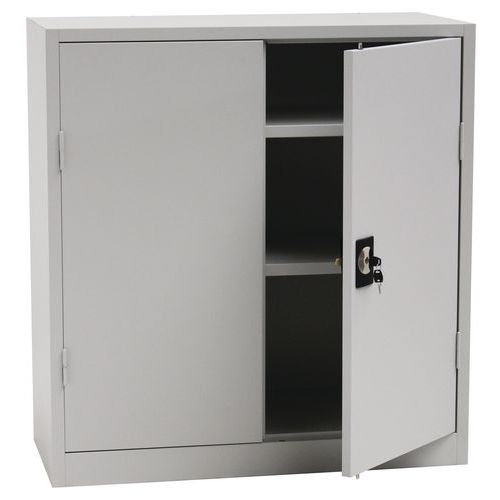 Alacsony Manutan fém komód mappák, iratok és egyéb irodai dokumentumok tárolására. Mindkét ajtó külső, 180°-ban nyitható, csillapítós zsanérokkal rendelkezik. A két állítható magasságú polc elegendő helyet biztosít. Felszerelhető függő irattartókhoz való kihúzható kerettel (nem tartozék). A szekrény zárását hárompontos hengerzár biztosítja. A zár a fogantyúba van beépítve. Gyártói garancia az ügyfélnek : 10 év Max. polcterhelés (kg) : 45 kg