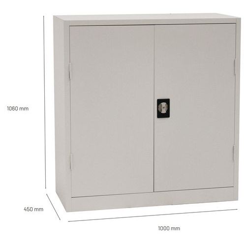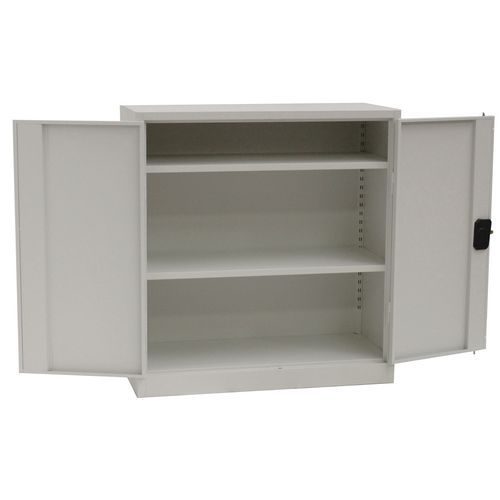 Alacsony Manutan fém komód mappák, iratok és egyéb irodai dokumentumok tárolására. Mindkét ajtó külső, 180°-ban nyitható, csillapítós zsanérokkal rendelkezik. A két állítható magasságú polc elegendő helyet biztosít. Felszerelhető függő irattartókhoz való kihúzható kerettel (nem tartozék). A szekrény zárását hárompontos hengerzár biztosítja. A zár a fogantyúba van beépítve. Gyártói garancia az ügyfélnek : 10 év Max. polcterhelés (kg) : 45 kg