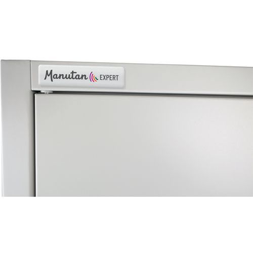Manutan Expert 2000 magas irodai fém szekrény mappák, iratok és egyéb irodai dokumentumok tárolására. Mindkét ajtó külső, 180°-ban nyitható, csillapítós zsanérokkal rendelkezik. A négy állítható magasságú polc elegendő helyet biztosít az iratoknak. Felszerelhető függő irattartókhoz való kihúzható kerettel (nem tartozék). A szekrény zárását hárompontos hengerzár biztosítja. A zár a fogantyúba van beépítve. A szekrény hátfalán lévő előfúrt rögzítőpontokon a fokozott biztonság és stabilitás érdekében a falhoz rögzíthető.