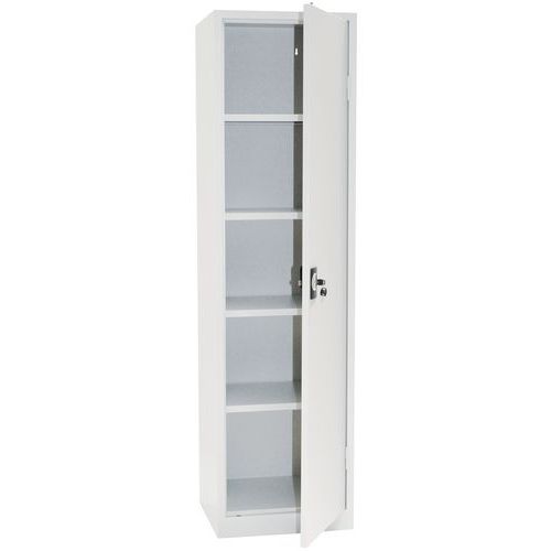 Manutan Expert magas irodai fém szekrények iratok és dokumentumok tárolására. Külső, 180°-ban elforgatható csuklópántos ajtók csillapítókkal. 4 állítható magasságú polccal az átlátható rendszerezéshez. Felszerelhető függő irattartókhoz való kihúzható kerettel (nem tartozék). A szekrény zárását hárompontos hengerzár biztosítja. A zár a fogantyúba van beépítve. A szekrény hátfalán lévő előfúrt rögzítőpontokon a fokozott biztonság és stabilitás érdekében a falhoz rögzíthető.
