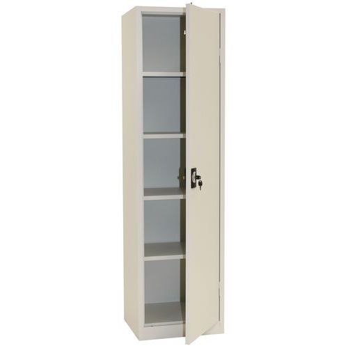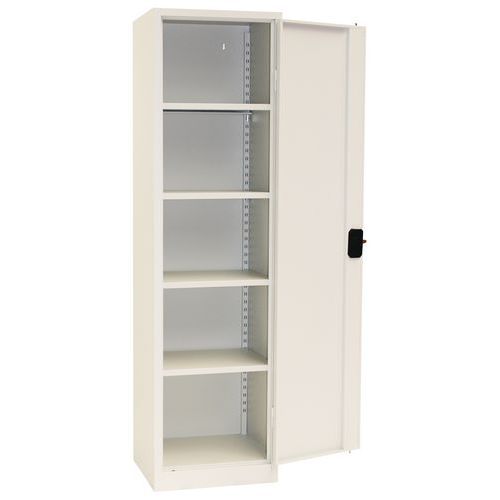Manutan Expert magas irodai fém szekrények iratok és dokumentumok tárolására. Külső, 180°-ban elforgatható csuklópántos ajtók csillapítókkal. 4 állítható magasságú polccal az átlátható rendszerezéshez. Felszerelhető függő irattartókhoz való kihúzható kerettel (nem tartozék). A szekrény zárását hárompontos hengerzár biztosítja. A zár a fogantyúba van beépítve. A szekrény hátfalán lévő előfúrt rögzítőpontokon a fokozott biztonság és stabilitás érdekében a falhoz rögzíthető.