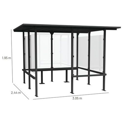 Dohányzófülke négyoldali üvegfallal az eső és a rossz időjárás elleni optimális védelem érdekében. Beépített fémpaddal. A biztonsági, edzett üveglapok vastagsága 4 mm. 50 x 50 mm-es tűzihorganyzott acélprofil szerkezettel. 200 °C-on égetett, hőre keményedő UV-álló poliészter festékkel felületkezelve. Állítható magasságú lábakkal (min. 1,95 m). A fülke a talajhoz rögzíthető. Beton alaphoz való rögzítésére használjon M12/65 horgonycsavarokat, tiszta sík aszfalthoz M12/120 menetes szárakat (minimális aszfaltvastagság: 7 cm).