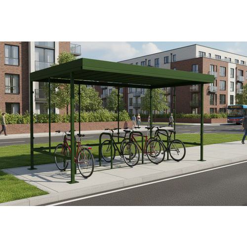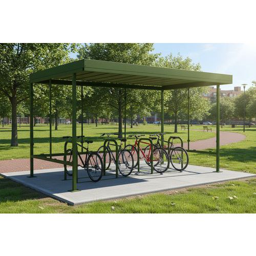 A kerékpártartóval ellátott üvegfülke megvédi a kerékpárokat az eső és az időjárás viszontagságaival szemben. A biztonsági, edzett üveglapok vastagsága 5 mm. Acéllemez tető, melyen PE ereszcsatornák biztosítják az esővíz elvezetést. 60 x 60 x 2 mm-es horganyzott acélprofil szerkezettel. A2 minőségű rozsdamentes acél rögzítőcsavarokkal. 200 °C-on égetett, hőre keményedő UV-álló poliészter festékkel felületkezelve. Négy lábbal, 200 x 200 x 5 mm-es, talajhoz rögzíthető talpakon. Beton alaphoz való rögzítésre használjon M12/65 horgonycsavarokat, tiszta sík aszfalthoz M12/120 menetes szárakat (minimális aszfaltvastagság: 7 cm).