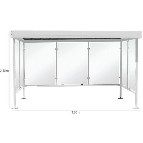 Kerékpártároló, dohányzó vagy buszmegálló fülkék üveg oldalfallal. A biztonsági, edzett üveglapok vastagsága 5 mm. Acéllemez tető, melyen PE ereszcsatornák biztosítják az esővíz elvezetést. 60 x 60 x 2 mm-es horganyzott acélprofil szerkezettel. A2 minőségű rozsdamentes acél rögzítőcsavarokkal. 200 °C-on égetett, hőre keményedő UV-álló poliészter festékkel felületkezelve. Négy lábbal, 200 x 200 x 5 mm-es, talajhoz rögzíthető talpakon. Beton alaphoz való rögzítésre használjon M12/65 horgonycsavarokat, tiszta sík aszfalthoz M12/120 menetes szárakat (minimális aszfaltvastagság: 7 cm). Gyártói garancia az ügyfélnek : 10 év