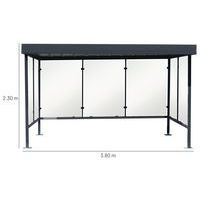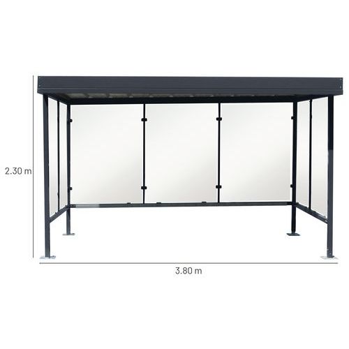 Kerékpártároló, dohányzó vagy buszmegálló fülkék üveg oldalfallal. A biztonsági, edzett üveglapok vastagsága 5 mm. Acéllemez tető, melyen PE ereszcsatornák biztosítják az esővíz elvezetést. 60 x 60 x 2 mm-es horganyzott acélprofil szerkezettel. A2 minőségű rozsdamentes acél rögzítőcsavarokkal. 200 °C-on égetett, hőre keményedő UV-álló poliészter festékkel felületkezelve. Négy lábbal, 200 x 200 x 5 mm-es, talajhoz rögzíthető talpakon. Beton alaphoz való rögzítésre használjon M12/65 horgonycsavarokat, tiszta sík aszfalthoz M12/120 menetes szárakat (minimális aszfaltvastagság: 7 cm).