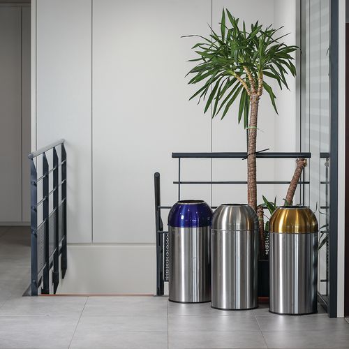 Rozsdamentes acél szemetes kosár kivehető alumínium belső edénnyel. A különböző színű fedeleknek köszönhetően a kosarak szelektív hulladékgyűjtésre használhatók. A fedelek 20 cm átmérőjű nyílással vannak ellátva. A kosár alulsó része gumírozott, így nem karcolja a padlót.