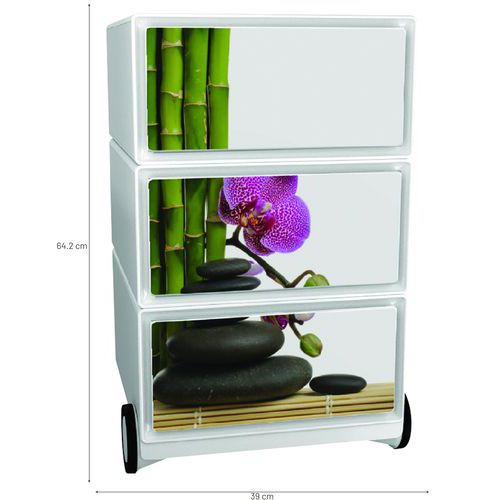 Mozgatható tárolók három fiókkal irodaszerek tárolására. A fiókok elülső felülete ABS műanyagból készül. A mozgathatóságot 4 kerék biztosítja, melyek közül kettő önbeálló. A fiókok belső hasznos mérete: 32,5 x 13,3 x 40,5 cm.