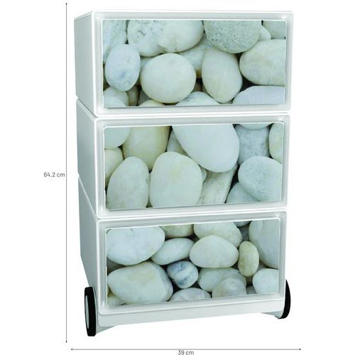 Mozgatható tárolók három fiókkal irodaszerek tárolására. A fiókok elülső felülete ABS műanyagból készül. A mozgathatóságot 4 kerék biztosítja, melyek közül kettő önbeálló. A fiókok belső hasznos mérete: 32,5 x 13,3 x 40,5 cm.