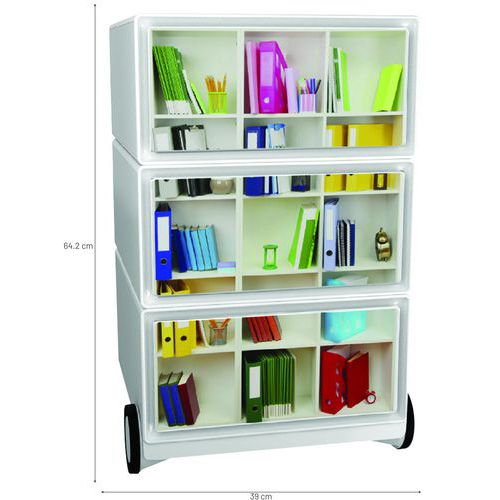 Mozgatható tárolók három fiókkal irodaszerek tárolására. A fiókok elülső felülete ABS műanyagból készül. A mozgathatóságot 4 kerék biztosítja, melyek közül kettő önbeálló. A fiókok belső hasznos mérete: 32,5 x 13,3 x 40,5 cm.