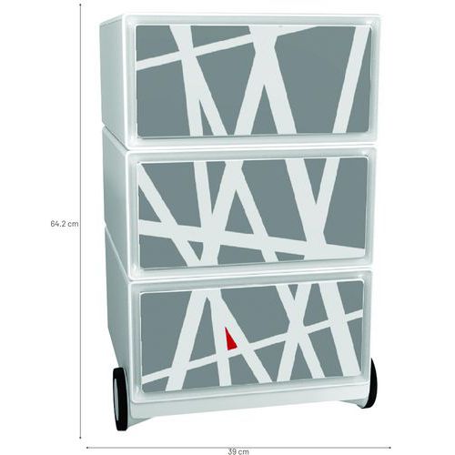 Mozgatható tárolók három fiókkal irodaszerek tárolására. A fiókok elülső felülete ABS műanyagból készül. A mozgathatóságot 4 kerék biztosítja, melyek közül kettő önbeálló. A fiókok belső hasznos mérete: 32,5 x 13,3 x 40,5 cm.
