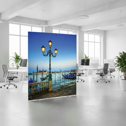 Térelválasztó vászon paraván különböző színű és mintájú kivitelekben. A vászon tűzállósága M1 kategóriába tartozik, 30°-on mosható. Két, fehérre lakkozott, stabil acéllábbal. A paraván gyorsan és egyszerűen összeszerelhető.