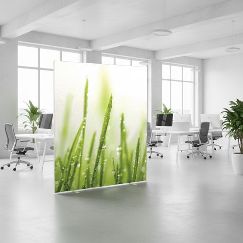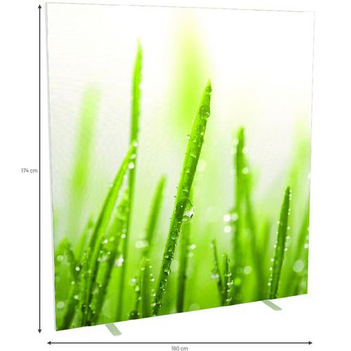 Térelválasztó vászon paraván különböző színű és mintájú kivitelekben. A vászon tűzállósága M1 kategóriába tartozik, 30°-on mosható. Két, fehérre lakkozott, stabil acéllábbal. A paraván gyorsan és egyszerűen összeszerelhető.