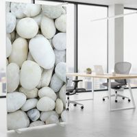 Irodai térelválasztó vászon paraván különböző színű és mintájú kivitelekben. A vászon tűzállósága M1 kategóriába tartozik, 30°-on mosható. Két, fehérre lakkozott, stabil acéllábbal. A paraván gyorsan és egyszerűen összeszerelhető.