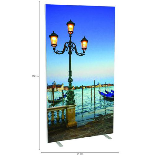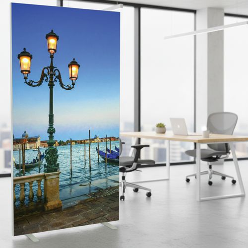 Irodai térelválasztó vászon paraván különböző színű és mintájú kivitelekben. A vászon tűzállósága M1 kategóriába tartozik, 30°-on mosható. Két, fehérre lakkozott, stabil acéllábbal. A paraván gyorsan és egyszerűen összeszerelhető. Gyártói garancia az ügyfélnek : 10 év