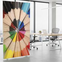 Irodai térelválasztó vászon paraván különböző színű és mintájú kivitelekben. A vászon tűzállósága M1 kategóriába tartozik, 30°-on mosható. Két, fehérre lakkozott, stabil acéllábbal. A paraván gyorsan és egyszerűen összeszerelhető.
