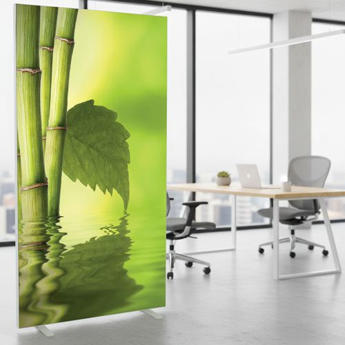 Irodai térelválasztó vászon paraván különböző színű és mintájú kivitelekben. A vászon tűzállósága M1 kategóriába tartozik, 30°-on mosható. Két, fehérre lakkozott, stabil acéllábbal. A paraván gyorsan és egyszerűen összeszerelhető.
