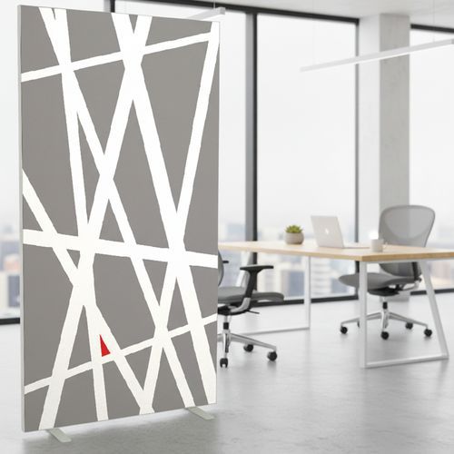 Irodai térelválasztó vászon paraván különböző színű és mintájú kivitelekben. A vászon tűzállósága M1 kategóriába tartozik, 30°-on mosható. Két, fehérre lakkozott, stabil acéllábbal. A paraván gyorsan és egyszerűen összeszerelhető.
