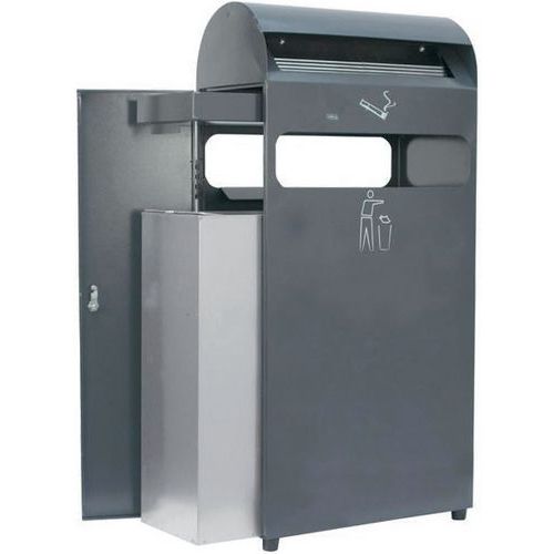 Szitanyomott, szabadon álló hamutartó/szemétgyűjtő. Erős, teljesen horganyzott, időjárás- és UV-álló. Rozsdamentes acél felület a cigaretták kihúzásához. Könnyű karbantartás: a belső tartály oldalról eltávolítható és kiüríthető. Korlátozásra tervezték. a felszabaduló füst mennyisége. Zár kulcsos zárral.