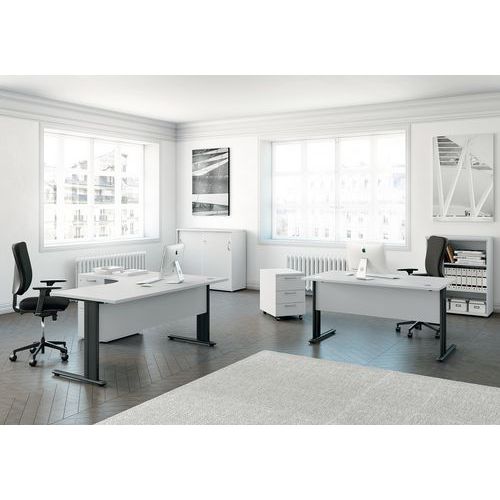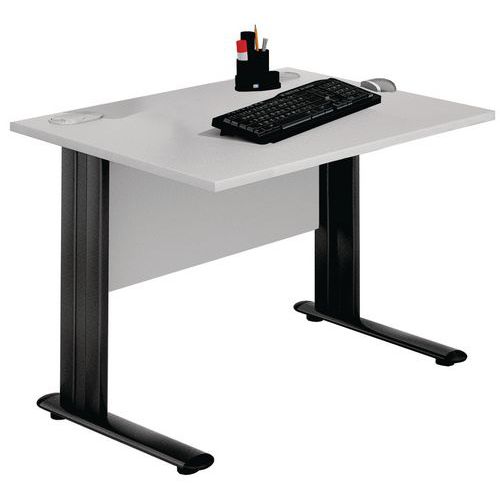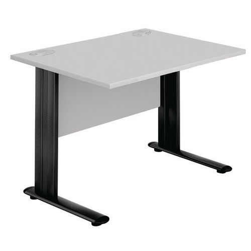 Világosszürke kivitelű irodai íróasztalok 25 mm vastag melamin panellappal. Tükröződésmentes, karcmentes kezelés antibakteriális tulajdonságokkal. 80 mm átmérőjű nyílás a munkalapon a kábelvezetéshez. A fém lábak kivehető burkolatok a kábelvezetéshez. .