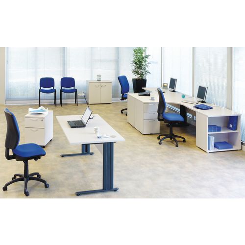 Világosszürke kivitelű irodai íróasztalok 25 mm vastag melamin panellappal. Tükröződésmentes, karcmentes kezelés antibakteriális tulajdonságokkal. 80 mm átmérőjű nyílás a munkalapon a kábelvezetéshez. A fém lábak kivehető burkolatok a kábelvezetéshez. . Szerelés : Szereléshez Gyártói garancia az ügyfélnek : 10 év