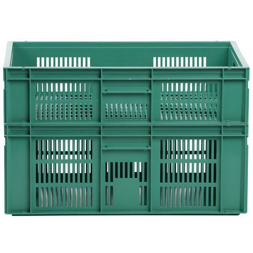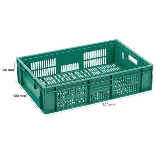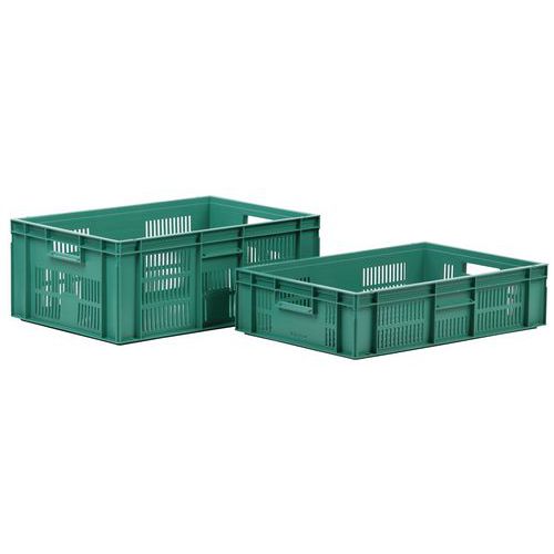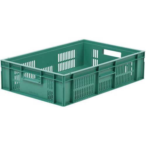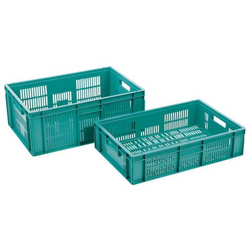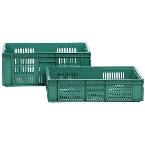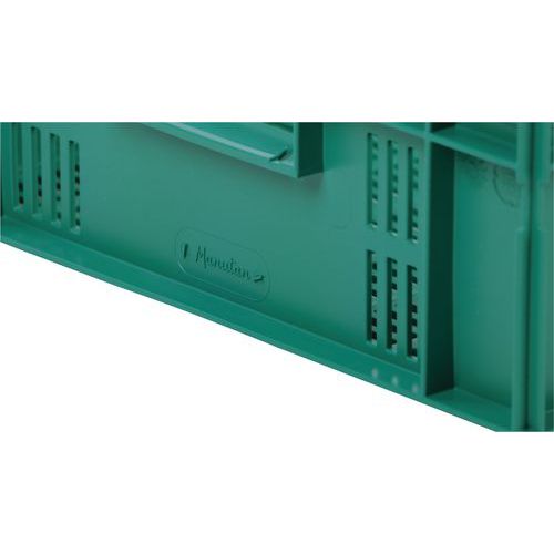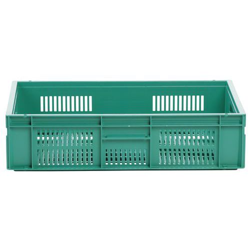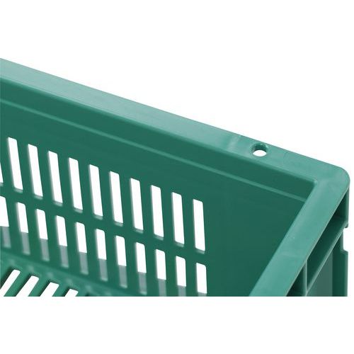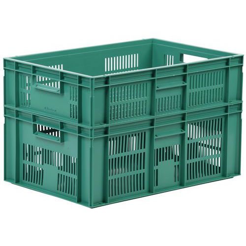 Nagyon robusztus, egymásra rakható műanyag dobozok zöld kivitelben. A doboz perforált oldalfalai. Magas halmozási stabilitás a megerősített éleknek köszönhetően.