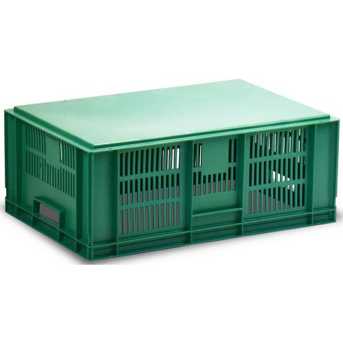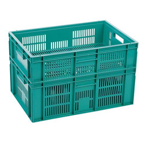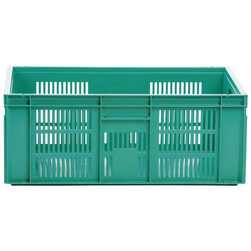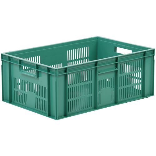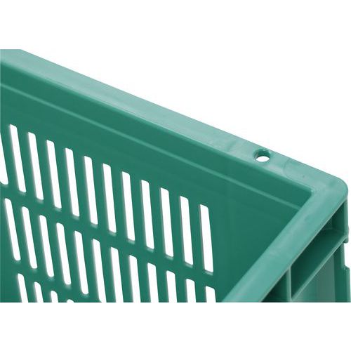 Nagyon robusztus, egymásra rakható műanyag dobozok zöld kivitelben. A doboz perforált oldalfalai. Magas halmozási stabilitás a megerősített éleknek köszönhetően.