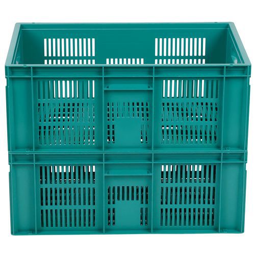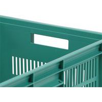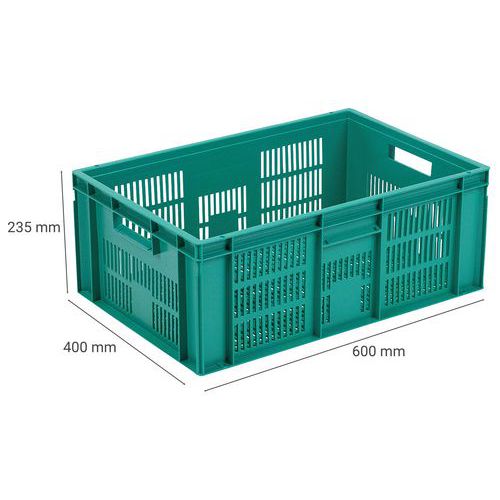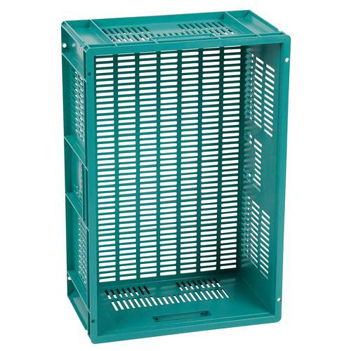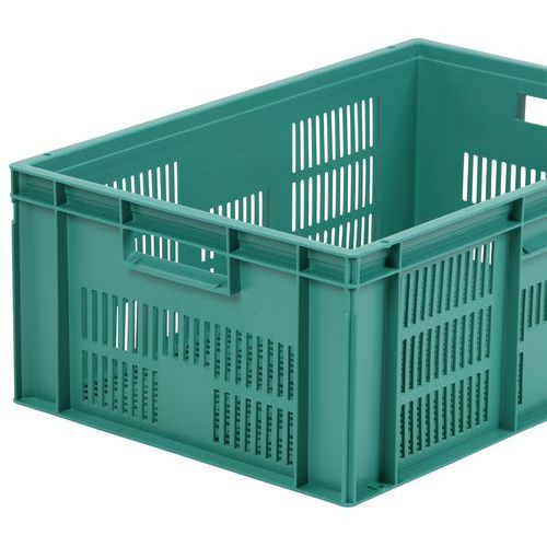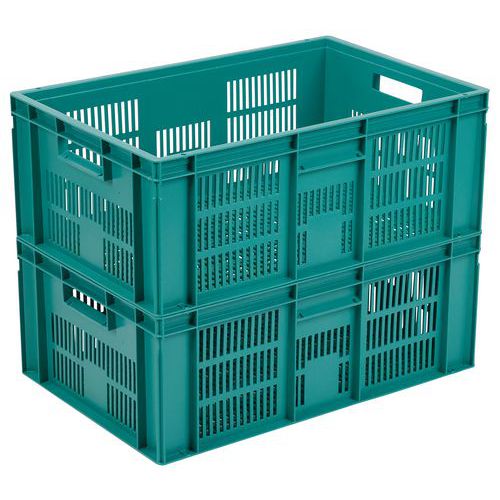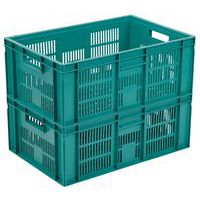 Nagyon robusztus, egymásra rakható műanyag dobozok zöld kivitelben. Perforált falak és a doboz alja. Nagy egymásra rakhatósági stabilitás a megerősített éleknek köszönhetően.
