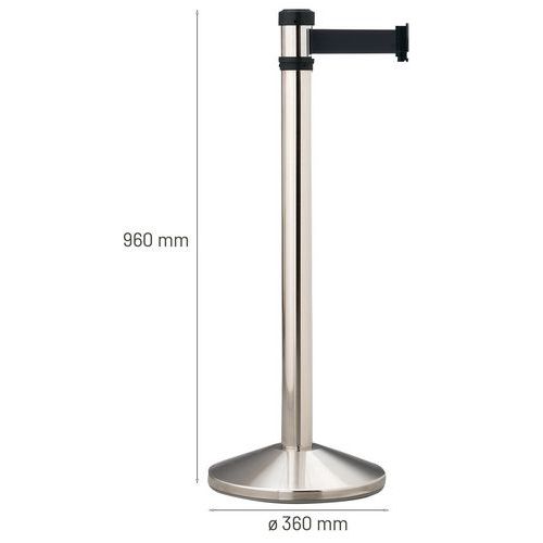 Torlaszoló oszlopok önvisszahúzó szalaggal, ideálisak a belépés megakadályozására, személyek ideiglenes navigálására stb. Gumibetéttel felszereltek a nagyobb stabilitás érdekében. Az oszlop feje lehetővé teszi további 3 szalag lezárását. A szalag falhoz rögzítéséhez meg kell vásárolni az 150199 fali rögzítőt.