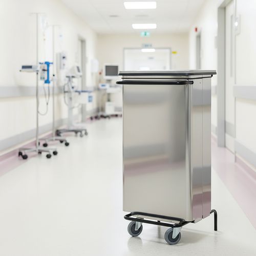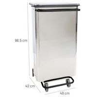 Rozsdamentes acél hulladékgyűjtő, lecsukódó fedéllel. A fedél a HACCP-nek megfelelően könnyen nyitható lábpedállal. Hulladékgyűjtő zsákkal használható. A hulladékgyűjtő fogantyúval és két gumikerékkel van felszerelve a könnyű mozgatás érdekében.