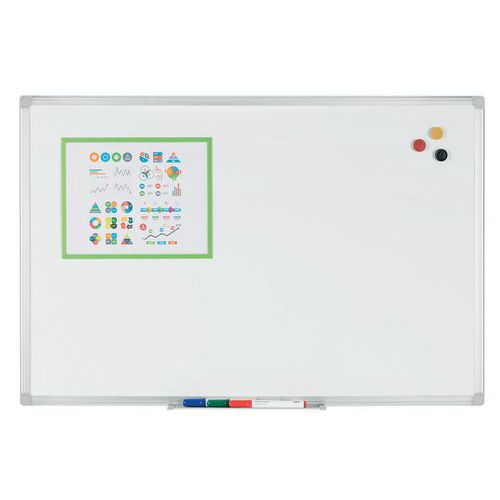 Mágneses felületű feliratozható fehér táblák. A táblalemez lakkozott acélból van. Alumínium keret műanyag sarkokkal. Száraz tisztítás mágneses törlő vagy törlőrongy segítségével. A műanyag tároló léc a keretbe rögzíthető.