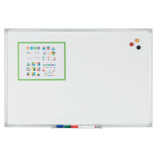 Mágneses felületű feliratozható fehér táblák. A táblalemez lakkozott acélból van. Alumínium keret műanyag sarkokkal. Száraz tisztítás mágneses törlő vagy törlőrongy segítségével. A műanyag tároló léc a keretbe rögzíthető. Gyártói garancia az ügyfélnek : 10 év Mágneses