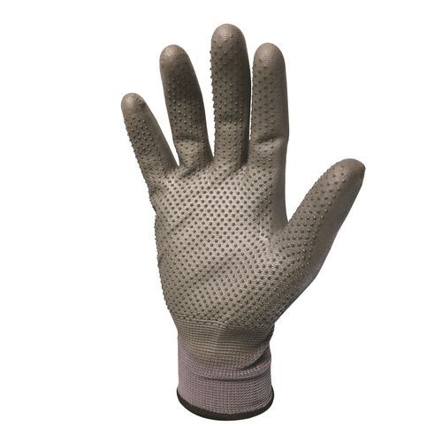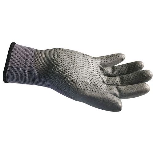 Rétegzett munkakesztyű PVC pöttyökkel mindennapi használatra. A poliuretán réteg a PVC pöttyökkel lefedi a tenyeret és az ujjakat. A pöttyök csökkentik a megmarkolt tárgy kicsúszásának veszélyét. A rugalmas ujjgallér megakadályozza a kesztyű lecsúszását és kényelmes viselést biztosít.